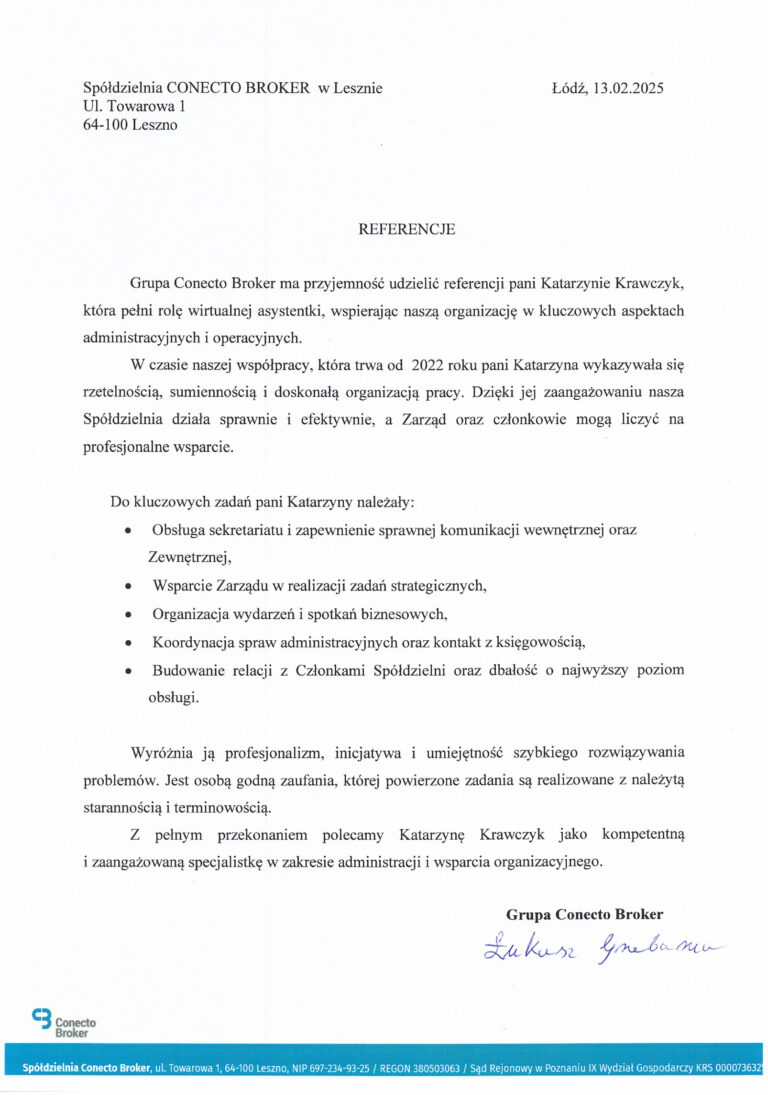 Jeżeli więc brak Ci już sił na niektóre obowiązki to wiedz, że ja wykonam je z radością. Pomogę Ci zarówno w sprawach zawodowych, jak i prywatnych. Jestem pewna, że nasza współpraca przerodzi się w prawdziwie przyjazną relację. Prywatnie od 25 lat jestem harcerką. Obecnie w stopniu podharcmistrza pełnię służbę jako z-ca komendanta ds. programowych i pracy z kadrą w Hufcu ZHP Głowno.